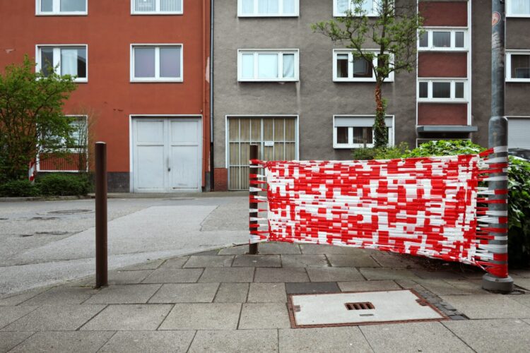 Kurator, Fotos: Denis Bury Absperrband ist das Material, mit dem die Dortmunder Künstlerin Birgit Feike Flächen erwebt: Zwischenräume von Schildern zu Bäumen zu Zäunen und …
